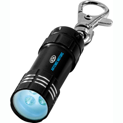 Schlüssellicht mit 3 weissen LEDs und Metall Karabiner. Inkl. Batterien. Der Artikel kann 4-farbig bedruckt oder gelasert werden. Wir empfehlen, aufgrund der Robustheit, das Logo mittels Lasergravur zu applizieren. Das Preisbeispiel untestehend ist mit einer Gravur kalkuliert: