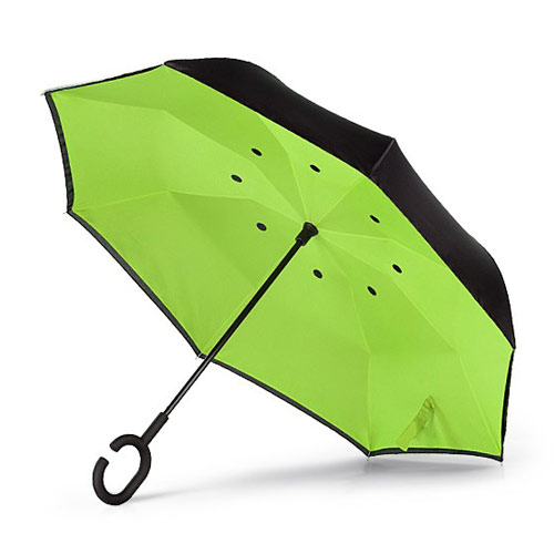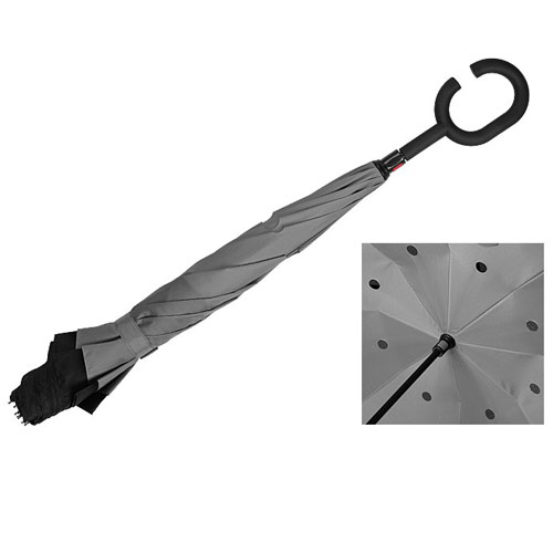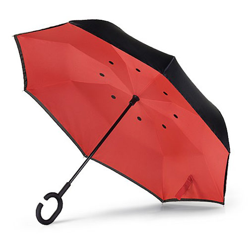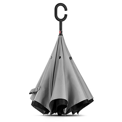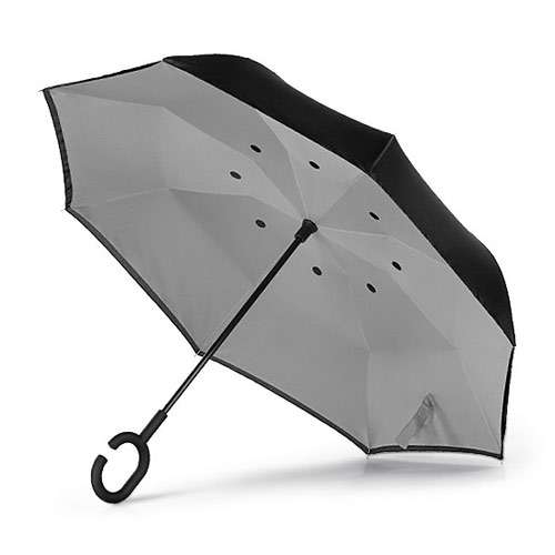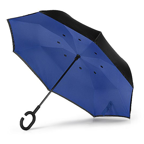 Wir haben ihn! Den umgedrehten! Der trendige Kompaktschirm mit 8 Segmenten und doppellagiger Polyester Bespannung schliesst nach Innen. Innendesign in vier verschiedenen Himmel-Farben erhältlich, aussen schwarz. Metallschaft und Kunststoffösen. Gummierter Kunststoffgriff mit Armschlaufe. Inkl. Schutzhülle. Spitze und Ösen aus Kunststoff, schwarz (Ø 12 mm).