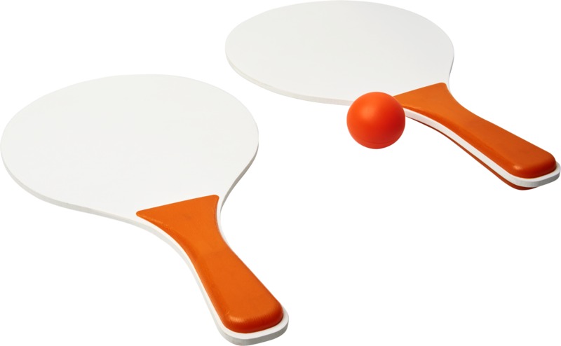Dieses Sportset aus Pappelholz sorgt für viel Spass und Bewegung zu zweit am Strand, im Park oder im Garten. Die Griffe sind mit PU-Band umwickelt und bieten maximalen Halt, wenn es beim Spiel lebhaft zugeht. Das Set ist komplett mit 2 Bällen aus PP-Material in einem Netzbeutel aus Polyester mit einer Größe von 45 x 26 cm verpackt.