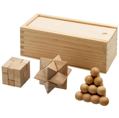 3 in 1 Puzzle-Set in einer Geschenkbox aus Holz. Werbeanbringung auf dem Deckel möglich, nicht auf dem Puzzle.