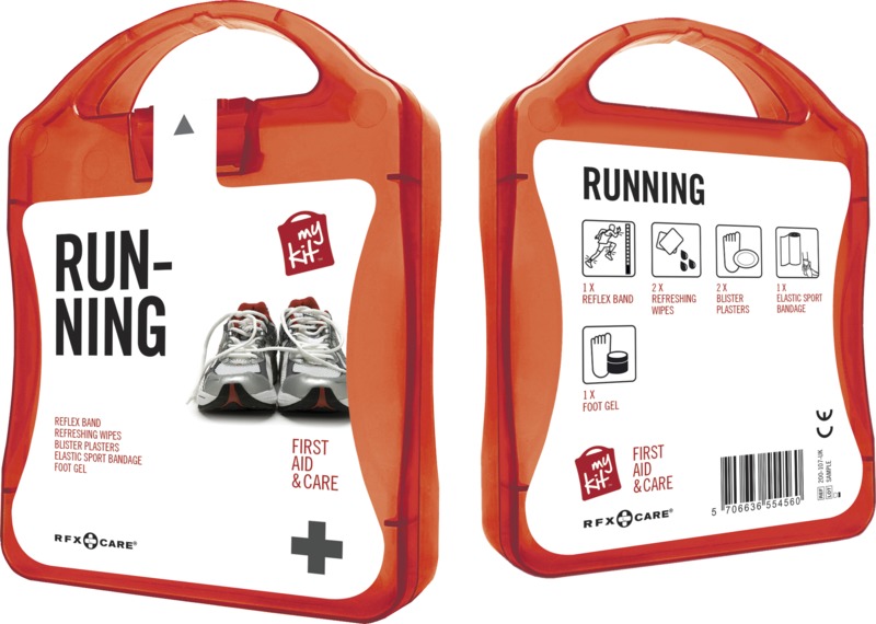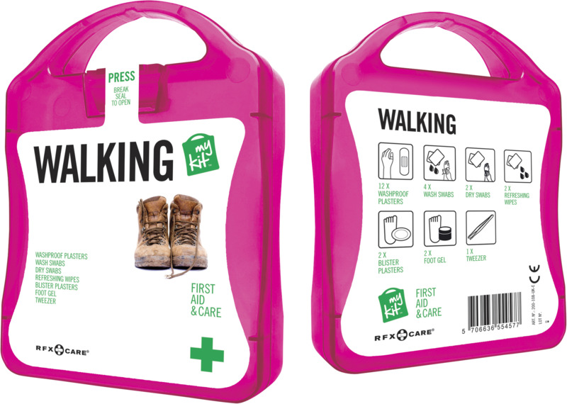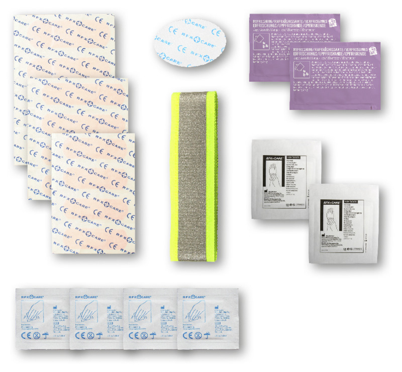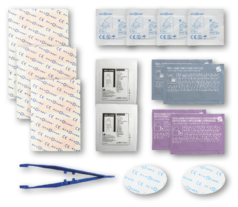 Inhalt: 1 reflektierendes Band, 2 Reinigungstücher, 2 Blasenpflaster, 1 elastischer Sportverband, 1 Fussgel. Alle im Set enthaltenen Erste-Hilfe- und Pflegeprodukte erfüllen alle geltenden EU-Vorschriften. Preis inkl. vollfarbigem Druck. Kunststoff.